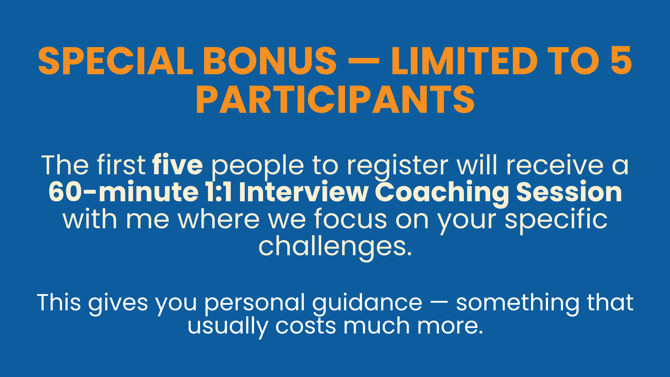 This workshop costs less than a single missed job opportunity — and gives you tools you can use for every interview in your career.Â